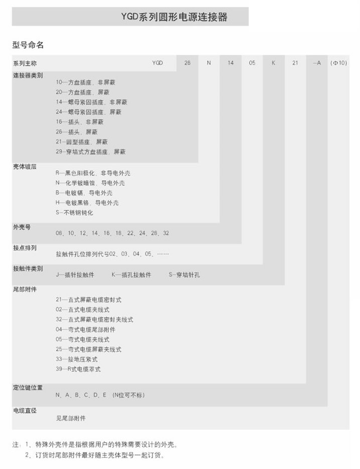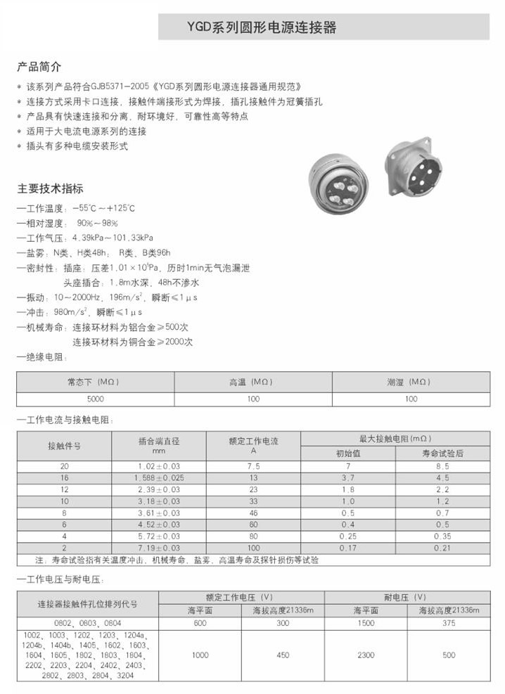 ● 该系列产品符合GJB5371-2005《YGD系列圆形电源连接器通用规范》